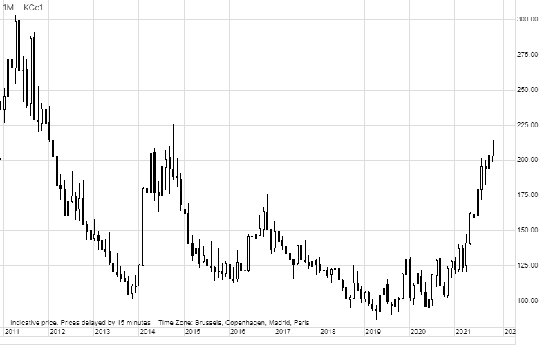 Coffee is another major food commodity currently hitting fresh multi-year highs. Driven by supply worries in Brazil and Columbia, the Arabica coffee future trading in New York has reached a seven-year high at $2.16 per pound. After averaging around $1.2 per pound between 2015 and 2020 due to an oversupplied market, the price has moved sharply higher this year. While congestions and delays in the global container freight market has been a challenge for shippers in recent months, the main reasons for the continued rally is due to tightening supply, with plunging production in Brazil. Drought and frost damage earlier in the year has not only reduced the latest crop but also raised concerns about the size of next seasons output. In Columbia, excess rain has cut yields while raised the risk of plant diseases.